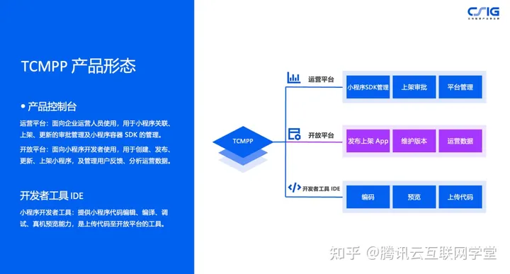 腾讯云小程序平台(Tencent Cloud Mini Program Platform,TCMPP)整合了腾讯在小程序开发、测试、发布、运营和小程序容器的技术能力,为企业客户提供一站式、覆盖全生命周期的小程序技术平台。
