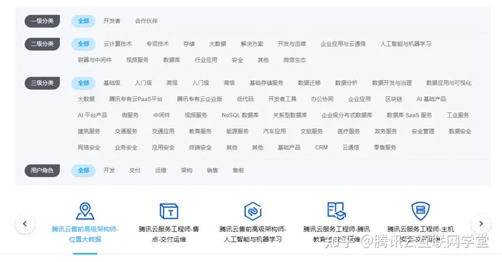 腾讯云认证考试体系分为两大模块:云计算技术认证和专项技术认证。