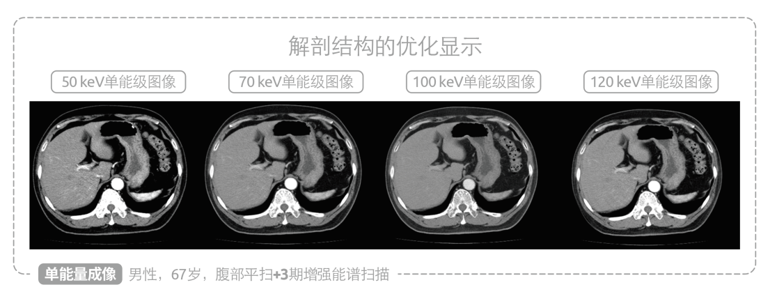 高分离度能谱成像:开影医疗独特的能谱创建模型获得精准的球管输出光谱,同时优化射线路径上的滤过分布,兼容优化光谱分布,最大限度地分离高低kV能谱,提供高分离度的能谱应用。