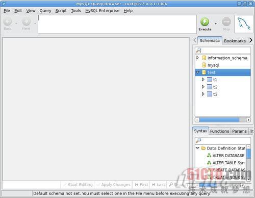 这个Query Browser窗口分为三个不同的区域。右侧的侧边栏分两行包含了几个标签,从这儿你可以查看数据库、书签和历史等,另外,它还提供一个SQL语法的参考部分。在顶部的Query窗口,你可以输入SQL代码。