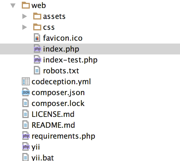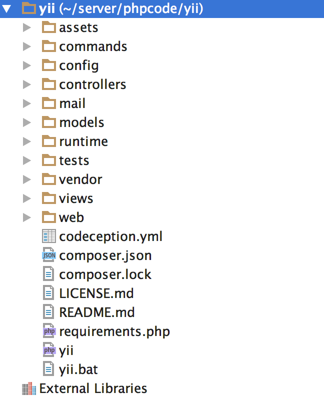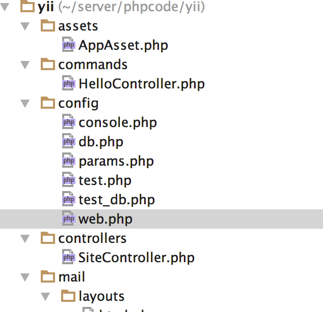 以上是整个文件夹的布局,里面的各个文件有啥用,我会在后续的【应用Yii2.0搭建后台应用框架】中详细介绍