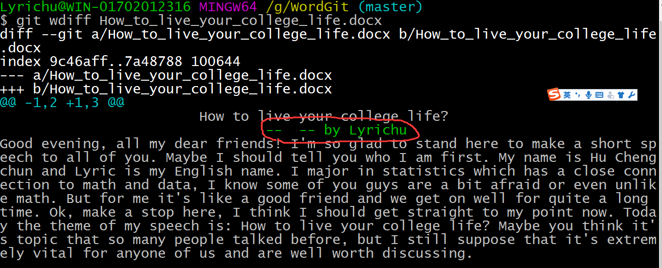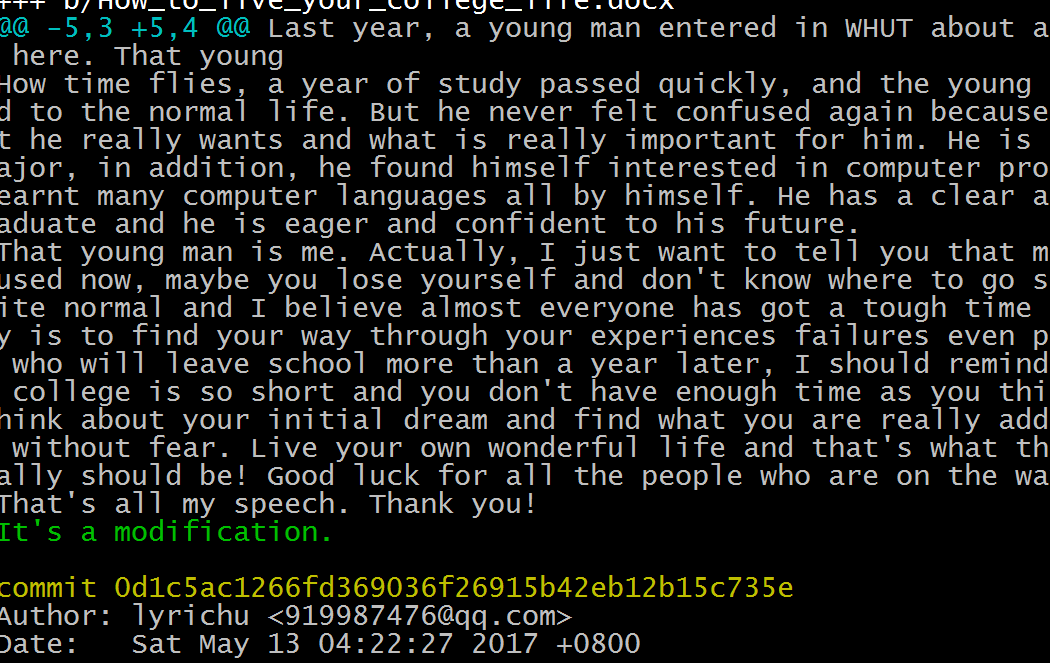 pandoc -s file.docx -t markdown -o file.md这个命令将你的.docx 文档转化为 .md markdown 格式。然后再 git add file.docx file.md (或者 git add .),git commit即可。 还是看我自己的一个实际的小例子吧。我在project 目录下有 一个名为 How_to_live_your_college_life.docx 的文档,在使用pandoc 转化为markdown之后,我 一次push,commit 然后我把标题改了一下,保存。在git bash 下,输入:git wdiff How_to_live_your_college_life.docx 得到结果如下图1所示:图1 图1中绿色红笔圈出来的部分就是我上一次修改的内容。 再执行git log -p --word-diff=color How_to_live_your_college_life.docx 命令,就会把历次修改的部分用绿色标注出来,如图2所示(部分):