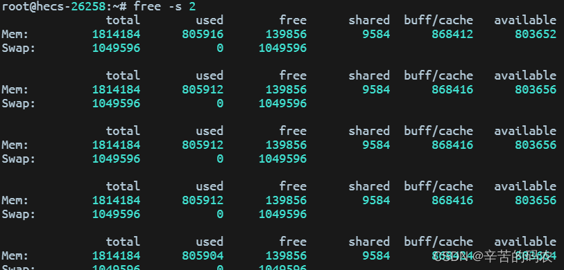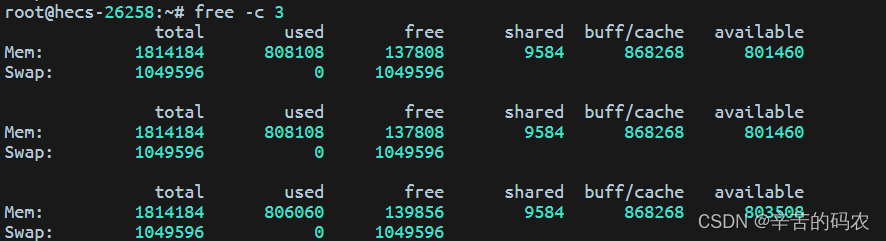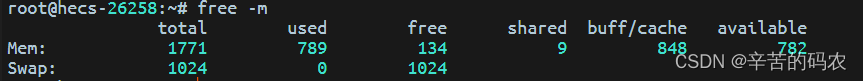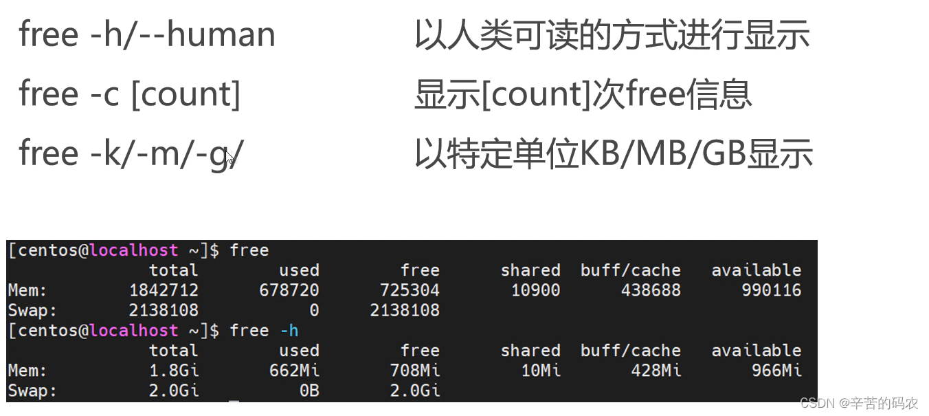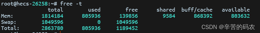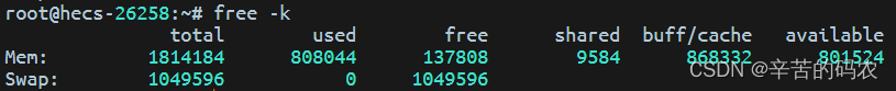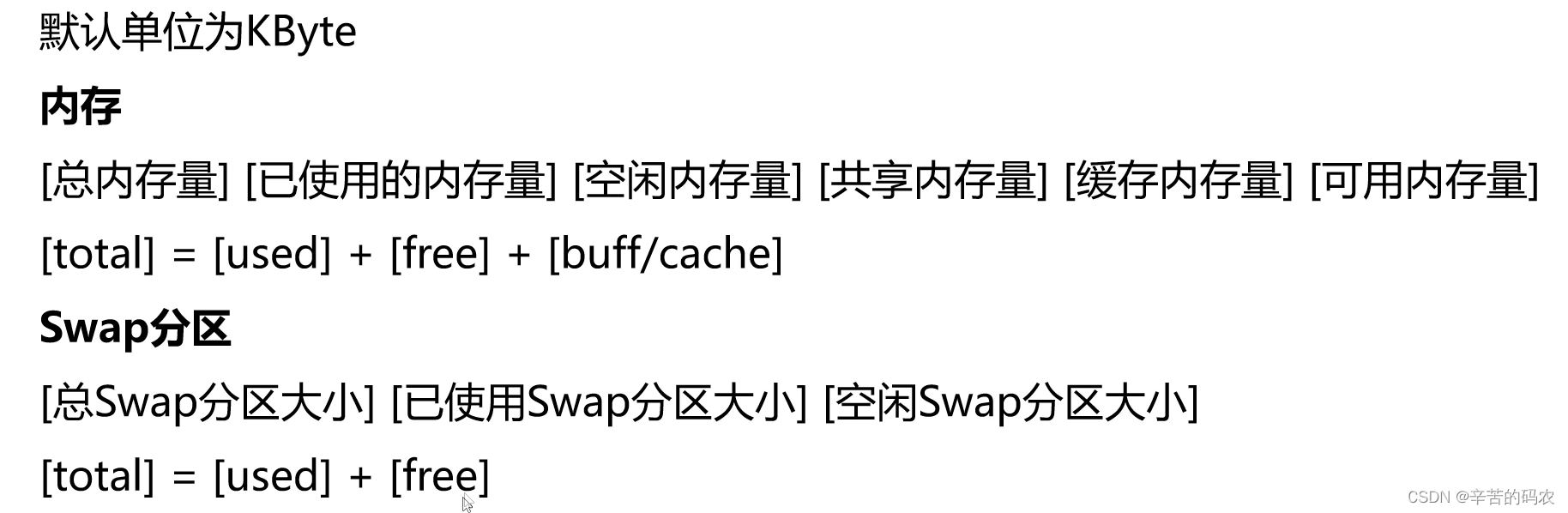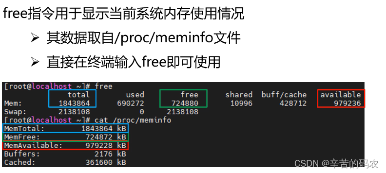 在Linux系统中,free命令用于显示系统内存的使用情况,包括物理内存、交换内存(swap)和内核缓冲区内存。这个命令对于监控系统内存状态非常有用,可以帮助管理员诊断内存使用问题。