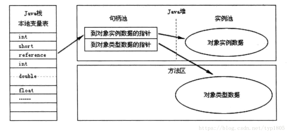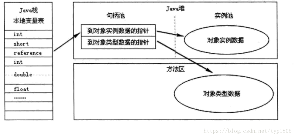 使用句柄方式:Java堆中将会划分出一块内存来作为句柄池,reference中存储的就是对象的句柄地址,而句柄中包含了对象实例数据和类型数据各自的具体地址信息。