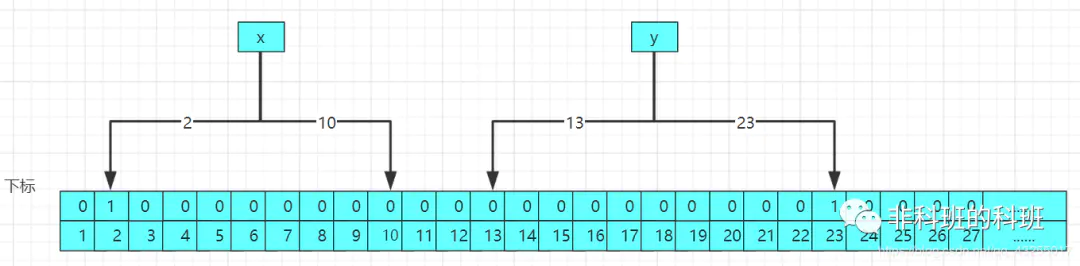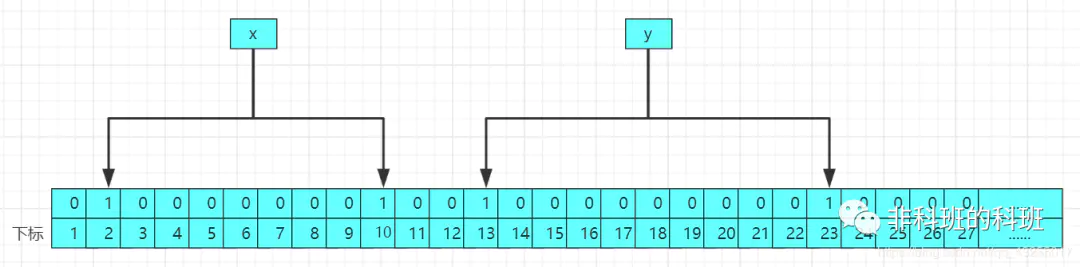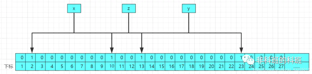 假设在我们多次存入值后,在布隆过滤器中存在x、y、z这三个值,布隆过滤器的存储结构图如下所示:
