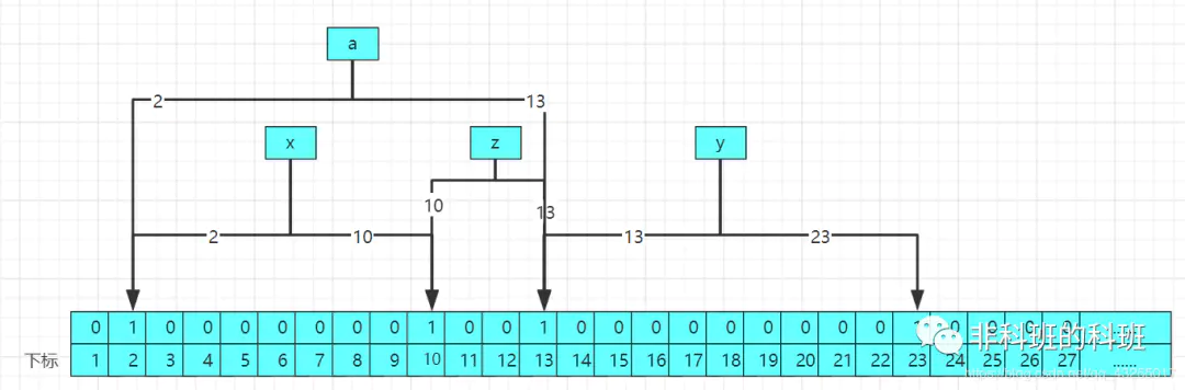 当我们要查询的时候,比如查询a这个数,实际中a这个数是不存在布隆过滤器中的,经过2个哈希函数计算后得到a的哈希值分别为2和13,结构原理图如下: