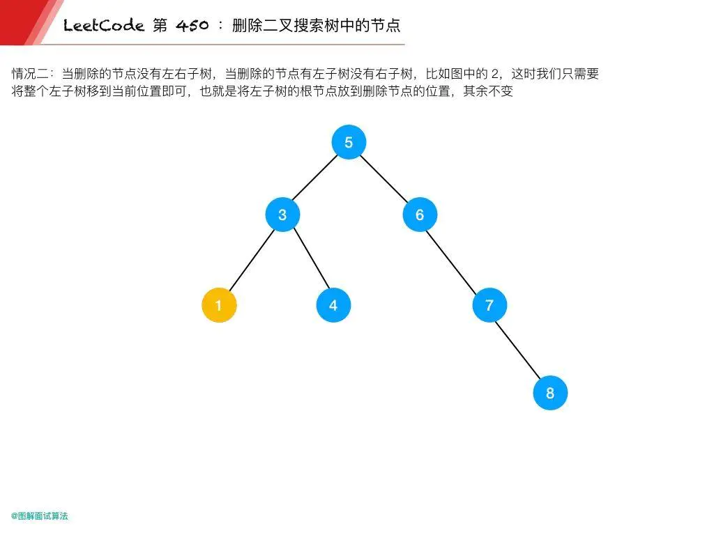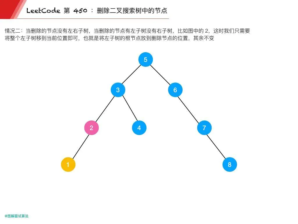 情况 2:当删除的节点有左子树没有右子树,比如上图的 2