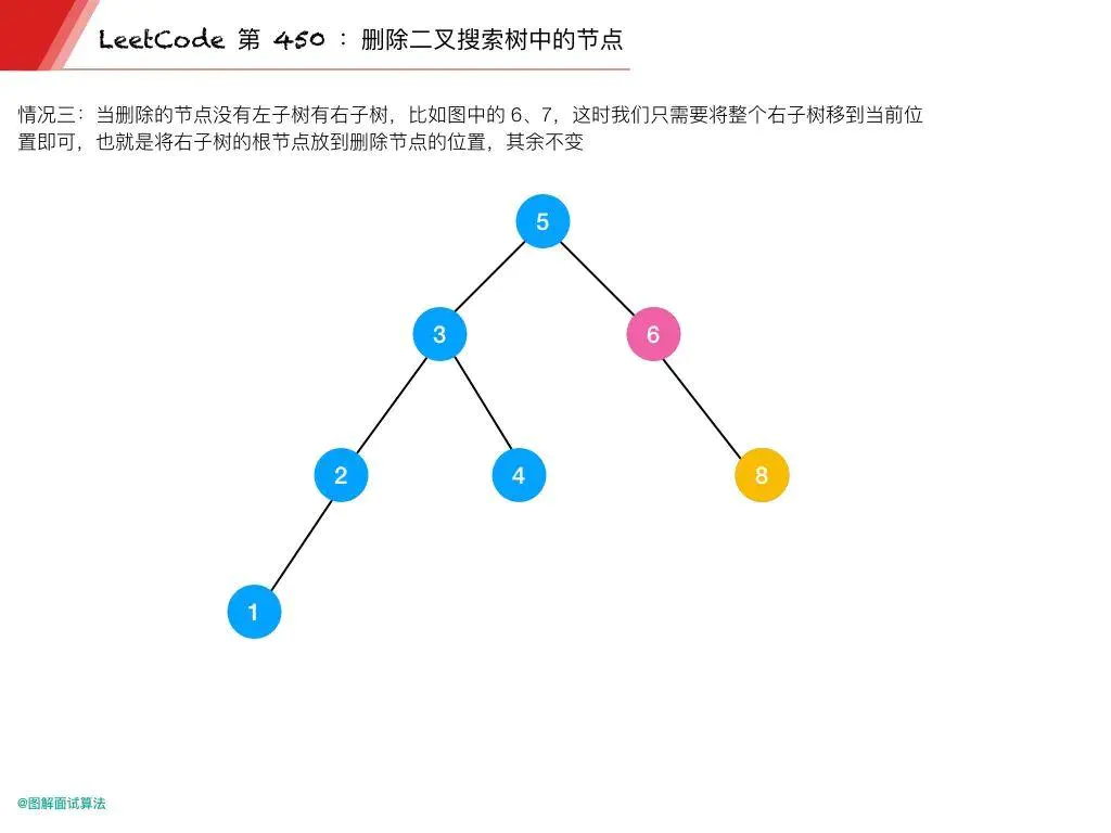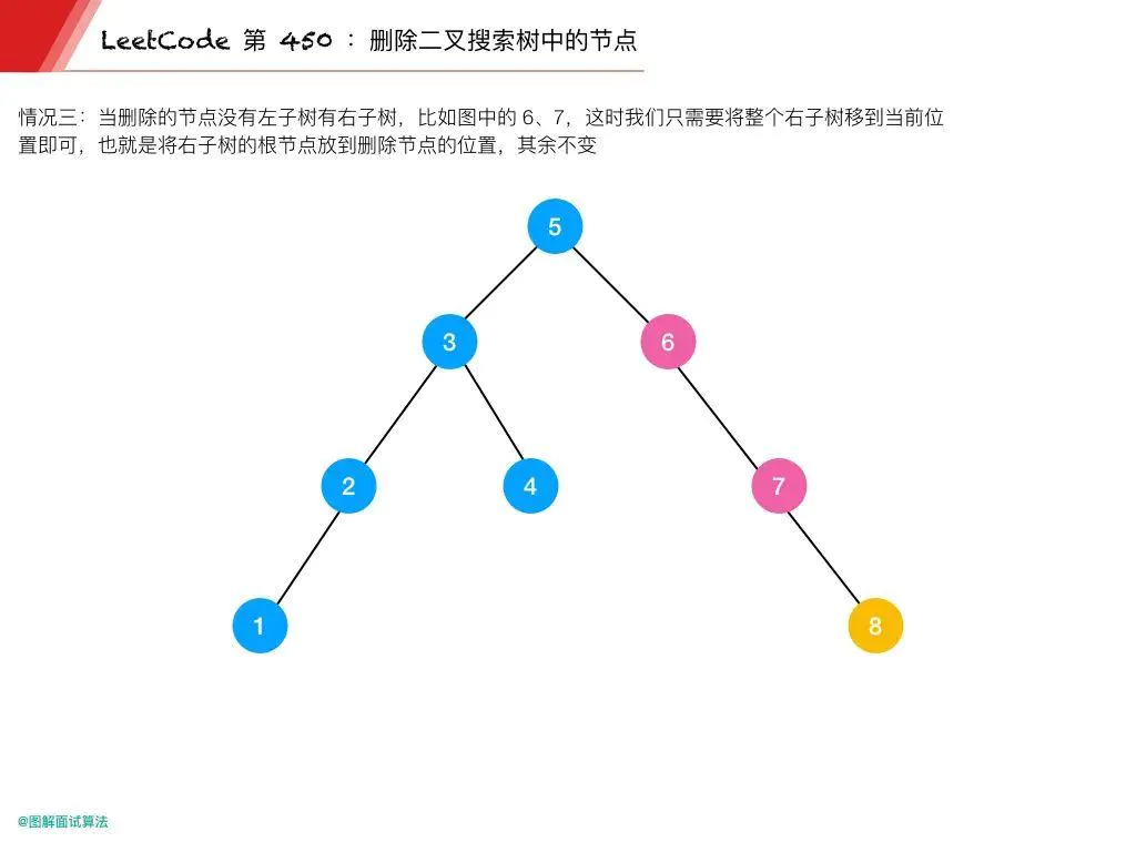 情况 3:当删除的节点没有左子树有右子树,比如上图的 6、7