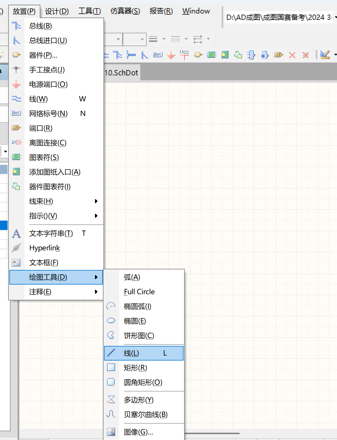 我习惯用【L】作为绘制图框的快捷键,如果用放置的办法也可以,不过要注意这里的放置的线不是导线,如图所示【放置】→【绘制工具】→【线】。按照题目的数据,画出图框,可以用复制粘贴,旋转等方式会快一些。