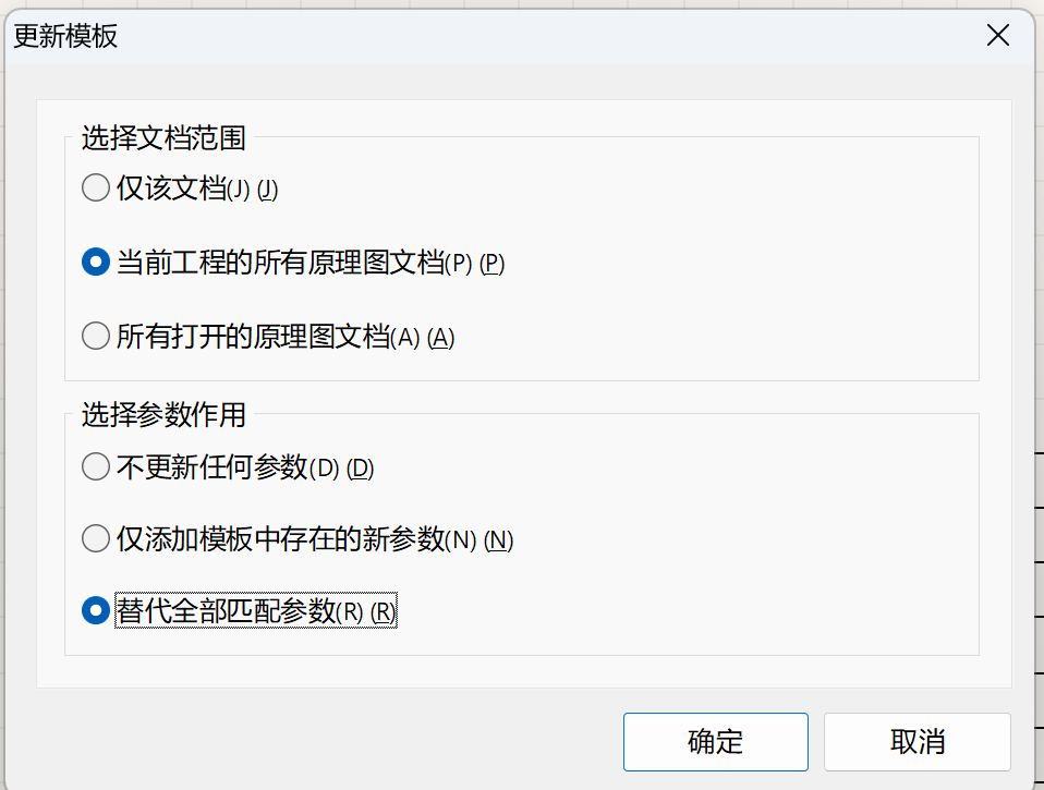 5.调用动态模板到各个原理图,并且修改原理图的页码。【设计】→【项目模板】→调用刚刚保存的原理图模板文件,弹出的【更新模板】→选择【当前工程的所有原理图文档】→【替代全部匹配参数】,最后要将每一页的页码手动改成对应的页码就完成了。