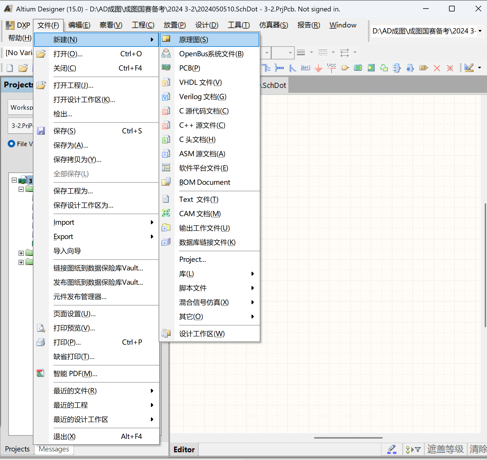 【文件】→【新建】→【原理图】→Ctrl+S(保存)→选择尾缀.SchDot