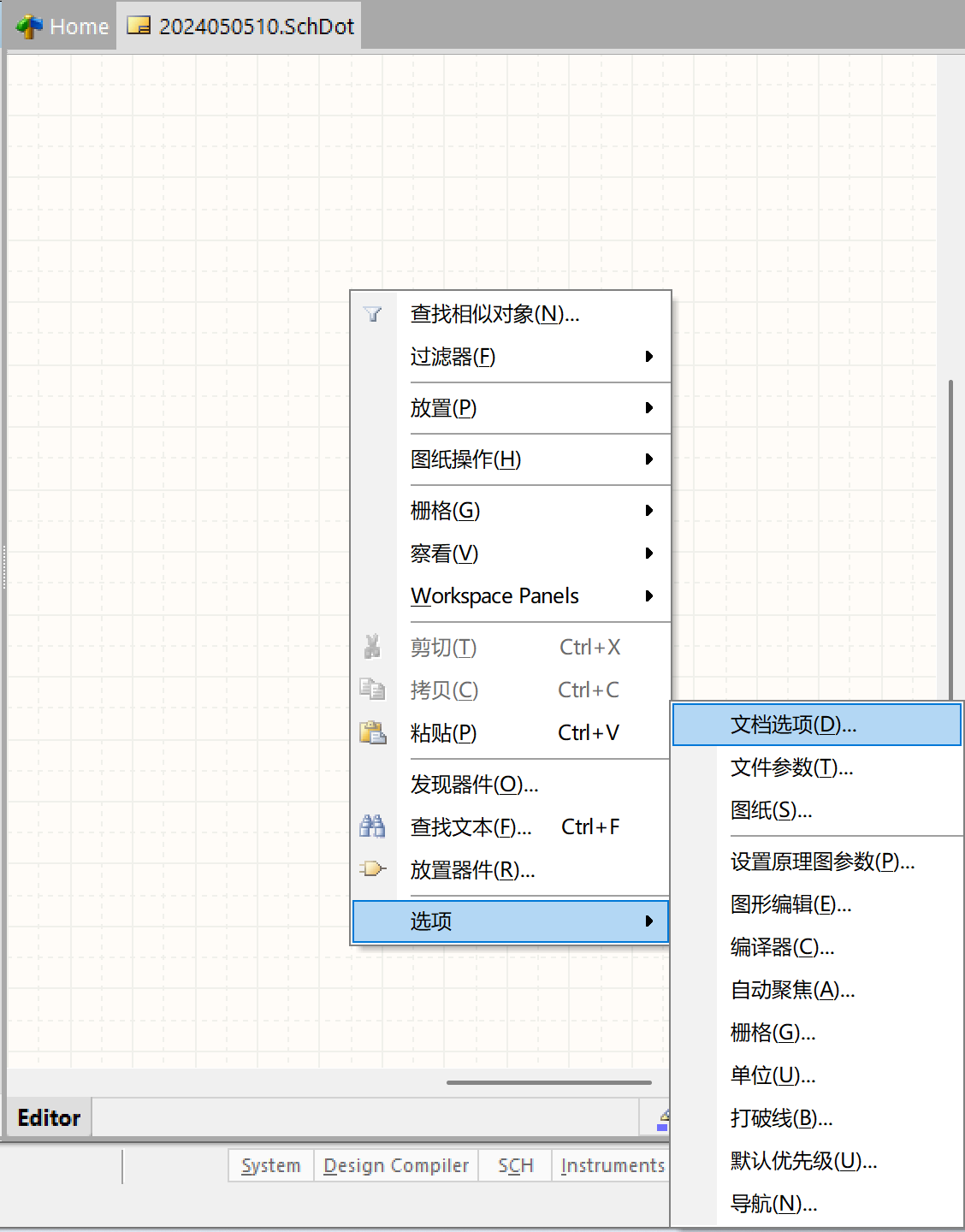 在刚刚新建好的原理图中鼠标点击右键→【选项】→【文档选项】→取消勾选【标题块】,这样新建的原理图右下角的默认标题块就会消失。