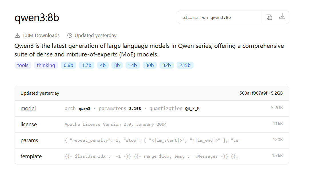 下载ollama,下载Qwen3模型相关操作参考博文:本地部署Deepseek R1模型,搭建个人知识库