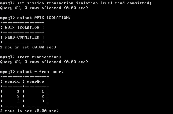 1)设置A的事务隔离级别,并进入事务做一次查询