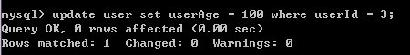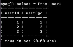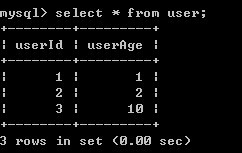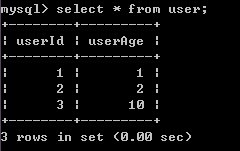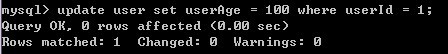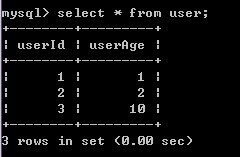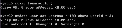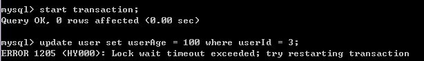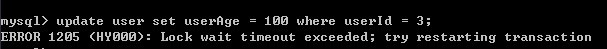 8)B表重新开始事务,并对user表进行修改,修改被挂起,直到超时,对另一条记录修改却成功,说明A对表进行修改时加了行共享锁(可以select)