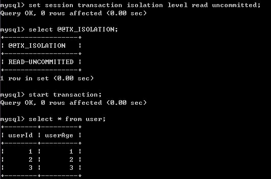 可以看出READ-UNCOMMITTED隔离级别,当两个事务同时进行时,即使事务没有提交,所做的修改也会对事务内的查询做出影响,这种级别显然很不安全。但是在表对某行进行修改时,会对该行加上行共享锁
