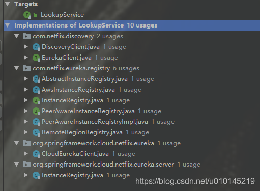 LookupService接口的实现类还有DiscoveryClient, 主要的作用是发现活跃的服务实例,那么可否认为Eureka Server也是一个Eureka Client呢,因为和DiscoveryClient功能实现很像。事实上是可以的,Eureka Server同时也是一个Eureka Client, 这就是在配置时要注意的,如果不想注册Eureka Server为Client时,registerWithEureka属性设置为true的原因。