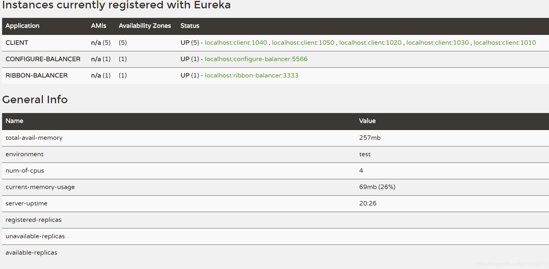将Client服务的端口改为1020,1040,1050,此时可以从图中看出1010和1030仍然还是注册的状态,显然已经断开连接。关于Eureka没能及时反馈正确连接情况,可以看之前关于Eureka的文章。