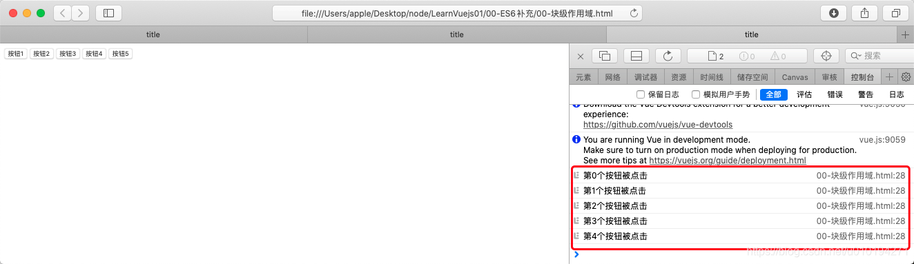 console.log('第'+i+'个按钮被点击')