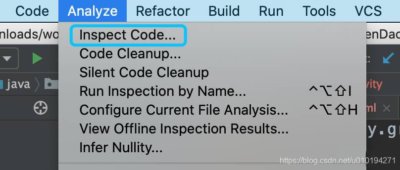 使用 Lint 查看未引用资源。Lint 是一个静态扫描工具,它可以识别出项目中没有被任何代码所引用到的资源文件。具体使用也很简单,只要在 Android Studio 中点击 Analyze -> Inspect Code,然后选中整个项目即可,如下所示: