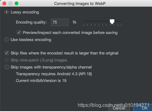 优先使用 VectorDrawable 图片,如果 UI 无法提供 VectorDrawable 图片,那么 webp 格式是一个不错的选择。Android Studio 也支持直接将 png 或者 jpg 格式图片转化为 webp 格式,如下所示: