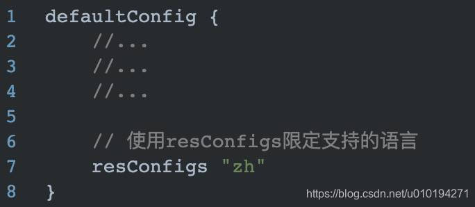 使用 resConfig 限定国际化资源文件。有时候我们使用到的三方库中可能会对各种国际化语言进行支持,但是我们自己的项目只支持某个语言,比如中文,那我们可以在 gradle 的 defaultConfig 中使用 resConfig 来限制打包到 APK 中的国际化资源文件,具体如下所示: