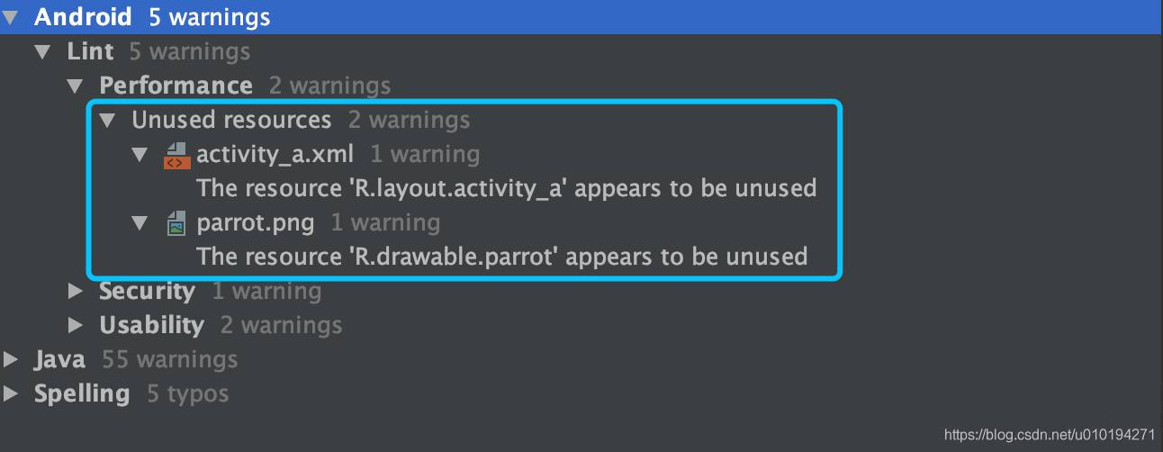 如果项目中有未被使用资源,则 Lint 会在窗口 Inspection Result 中显示,类似结果如下: