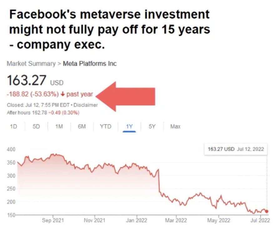 我们最近在 Facebook 股票上看到了这一点。当高管们透露他们的 Metaverse 投资可能不会在“15 年后”得到回报时,它从历史高点下跌了 50%。