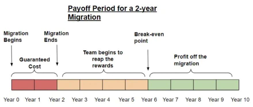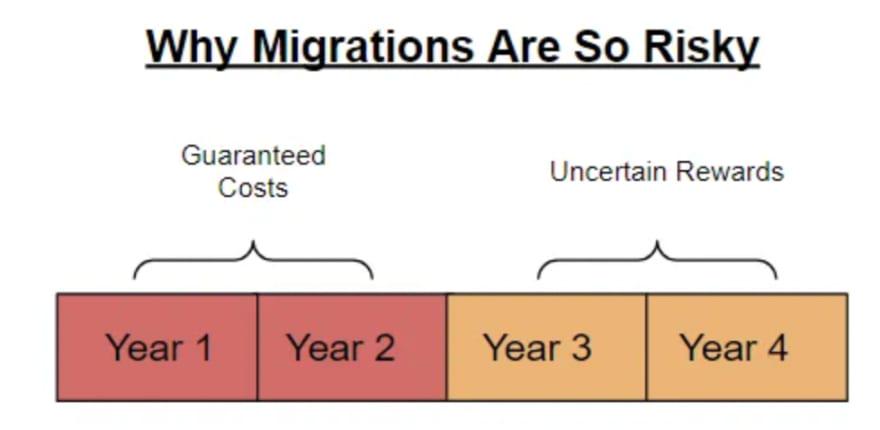 其次,任何迁移的回报都必须超过工作成本。花两年时间来节省两年时间是没有意义的。那时您还不如根本不进行迁移。