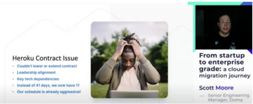 然而,到最后,Doma 与 Heroku 的合同出现了问题。Heroku 不允许他们以较低的数量续签合同,只向 Doma 提供了另一份长期合同的选择权。因此,如果 Doma 没有及时完成到 Azure 的迁移,他们的云基础设施可能会被切断。