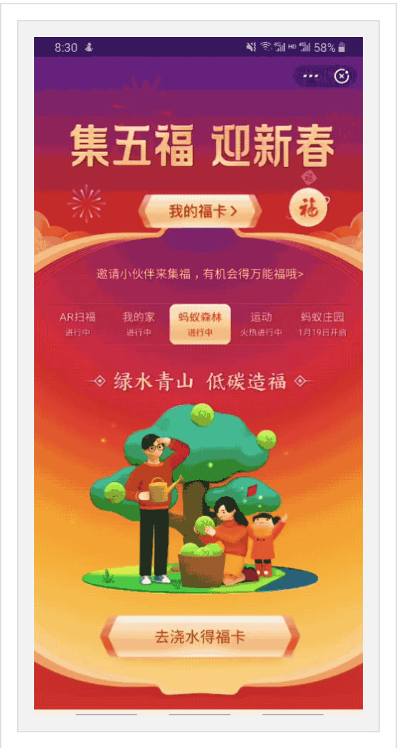 交互:操作简单,一步直达,玩法简单直白,包括扫一扫、领福袋、浇水得福卡,运动得福卡等,每项得卡方式基本没有学习成本,老少皆宜。
