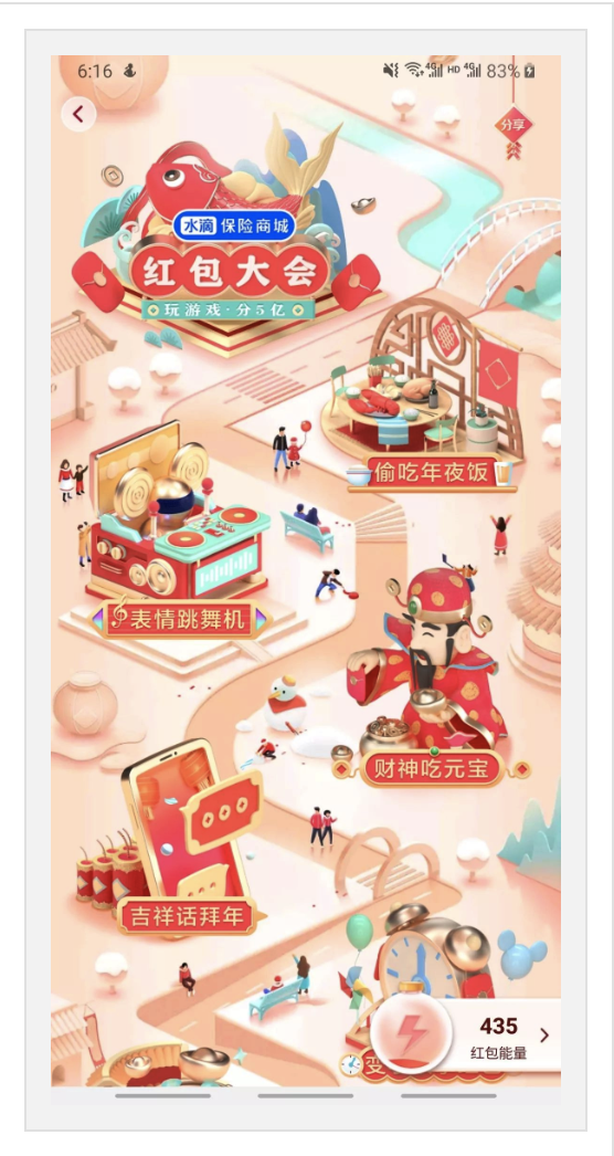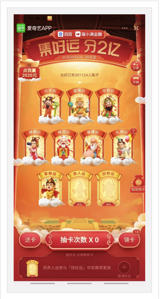 百度一直在春节活动中扮演着配角,这两年的春节活动基本也是以推广自家产品和抽卡为主,从界面上来说百度一直是具有很高的质量,层次明确,细节丰富。