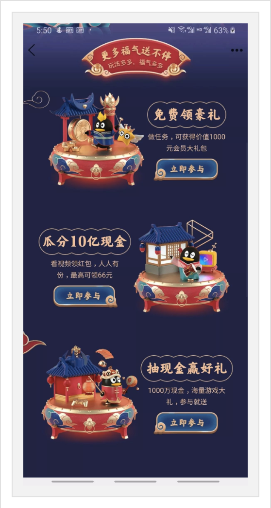 视觉:今年QQ的春节活动视觉是本人最喜欢的,无论是春节符号、字体设计都加入了很多小心思,从颜色上摒弃了艳俗的红色,加入了蓝灰色来中和整个画面,QQ企鹅形象贯穿始终,强化品牌印象,同样的,C4D被大量使用,细节很丰富。