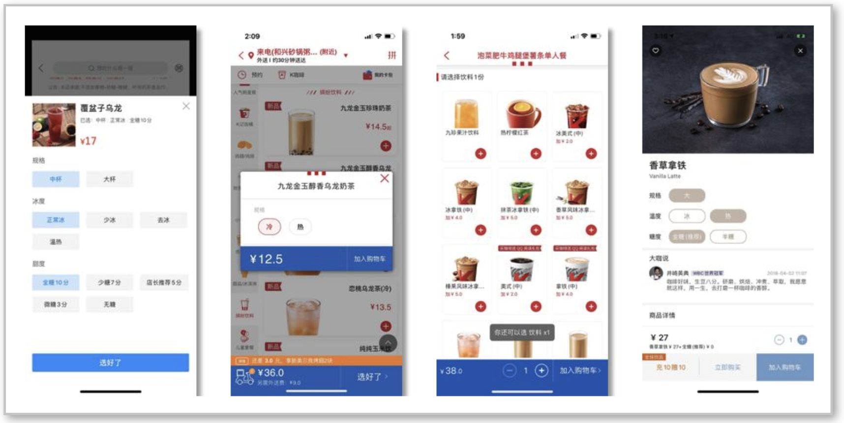 (2)KFC的商品有两种选择规格的方式,默认加入购物车。饮品只需要选择冷/热,通过弹窗选择;套餐的自定义搭配则跳转新页面选择,KFC的套餐可高度自定义,每个套餐平均有1-2个需要选择的内容(小食、饮品),但是并无套餐模板作为默认选项,每一个都需要用户手动选择;没有明显引导,用户在提交之后才弹出提示;流程冗长,体验较差