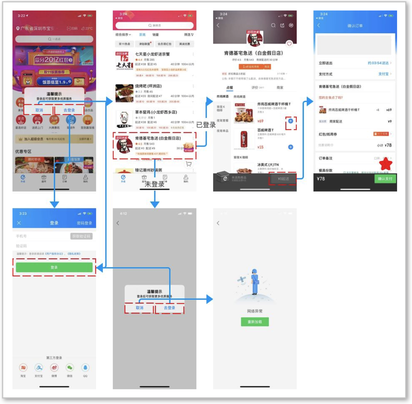 瑞幸的新用户优惠券是在用户登录后弹出,侧重引导下单,但是在领取后跳转回了首页,未记录已选商品,用户需要重新操作,体验极差。KFC的新用户优惠券是在游客状态进入首页时弹出,侧重引导注册/登录,但是如果登录账户并非新用户,则无法领取新用户优惠券,在登录后没有延续流程的相关说明(为什么优惠券没有了),体验较差。饿了么则通过限制功能权限的方式来强制让用户登录。