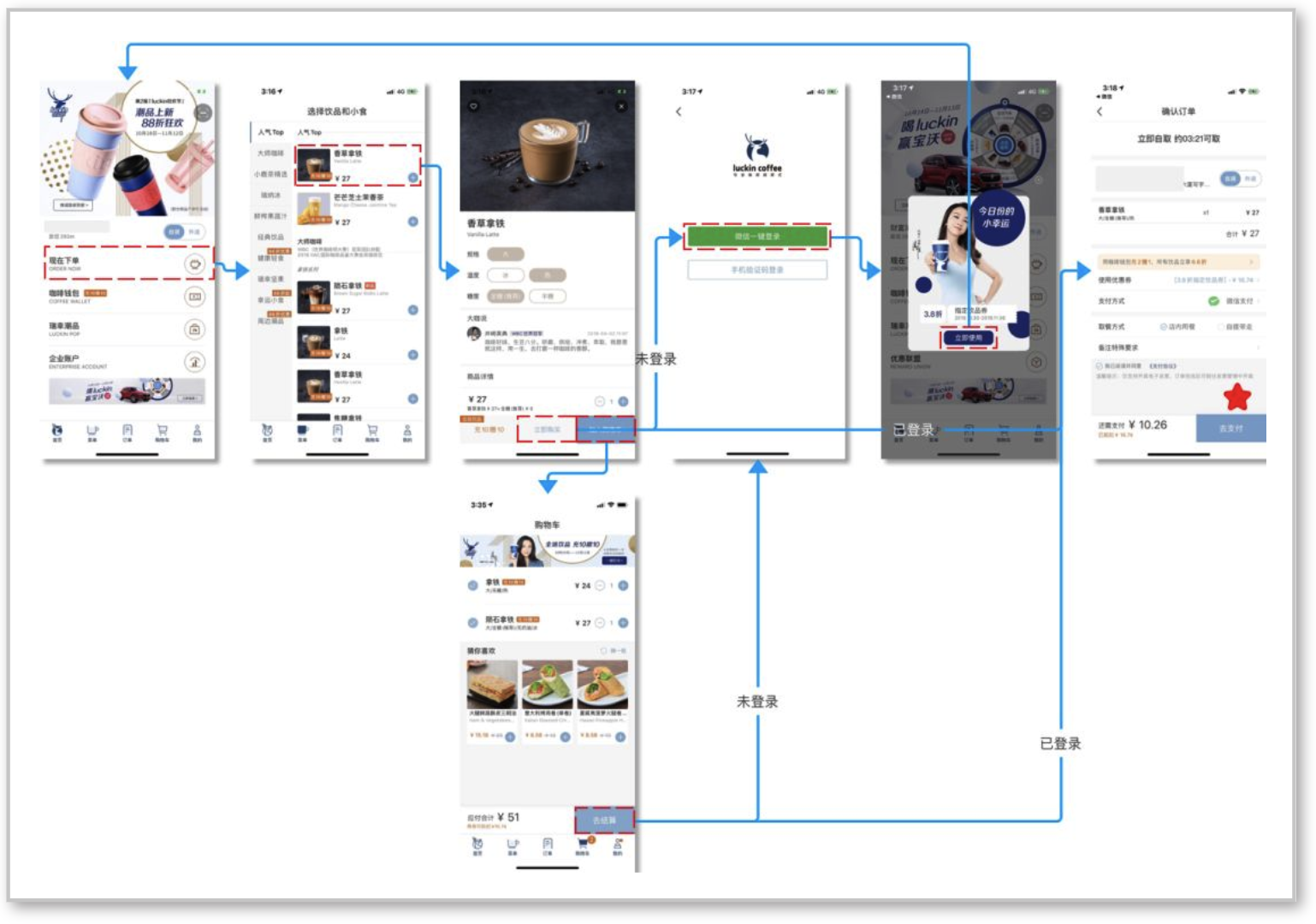 (3)瑞幸的选择规格虽然有页面跳转,但是用户可以自己选择立即购买or加入购物车,既给用户选择又确保路径清晰流程简洁。