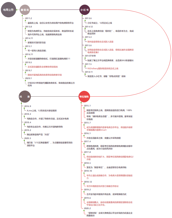 蘑菇街和考拉海购一开始便定位自营电商平台,从迭代史可以看出,二者在供应链体系建设上有很大的发力,尤其网易考拉,强大的供应链资源为其海淘100%正品提供了保证(物流、保税仓相关工作红字标出)。