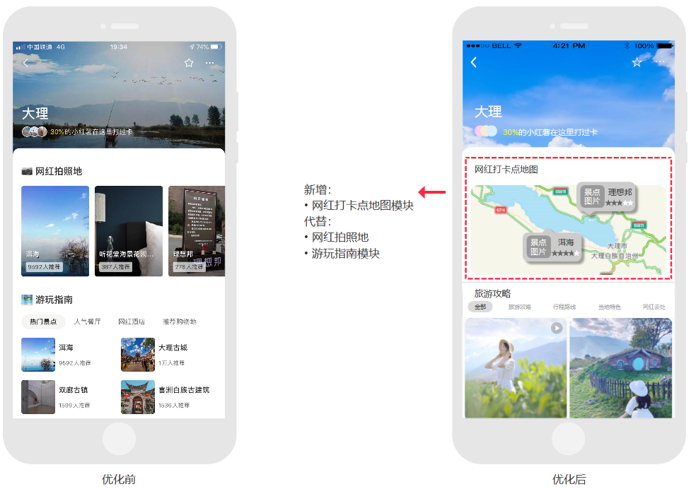 1)将地点卡片中【网红拍照地】模块和【游玩指南】模块整合到【网红打卡点地图】模块中,地点详情页增加小红书地图入口;
