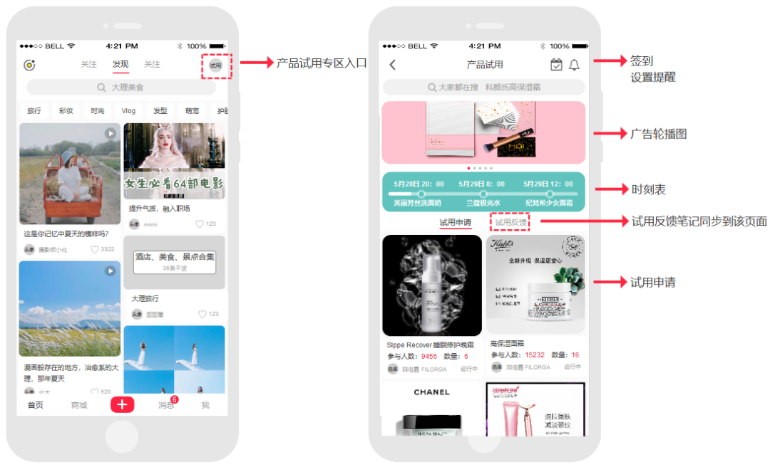 1)与品牌合作,赠送一定数量的产品小样给提交申请的用户,并要求其使用后一定时间内输出一篇笔记,发布的笔记会有试用tag,并同步呈现在【产品试用专区】;