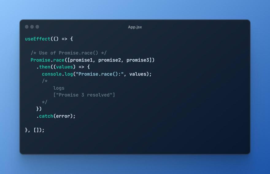 下面的实例使用的Promise.race()方法接受一组承诺并等待第一个承诺被解决或拒绝。一旦第一个承诺被解决,then()方法就会被执行,它返回第一个已解决承诺的已解决或被拒绝的值。在这种情况下,第三个承诺在其他两个之前得到解决,因此它的值被记录到控制台。