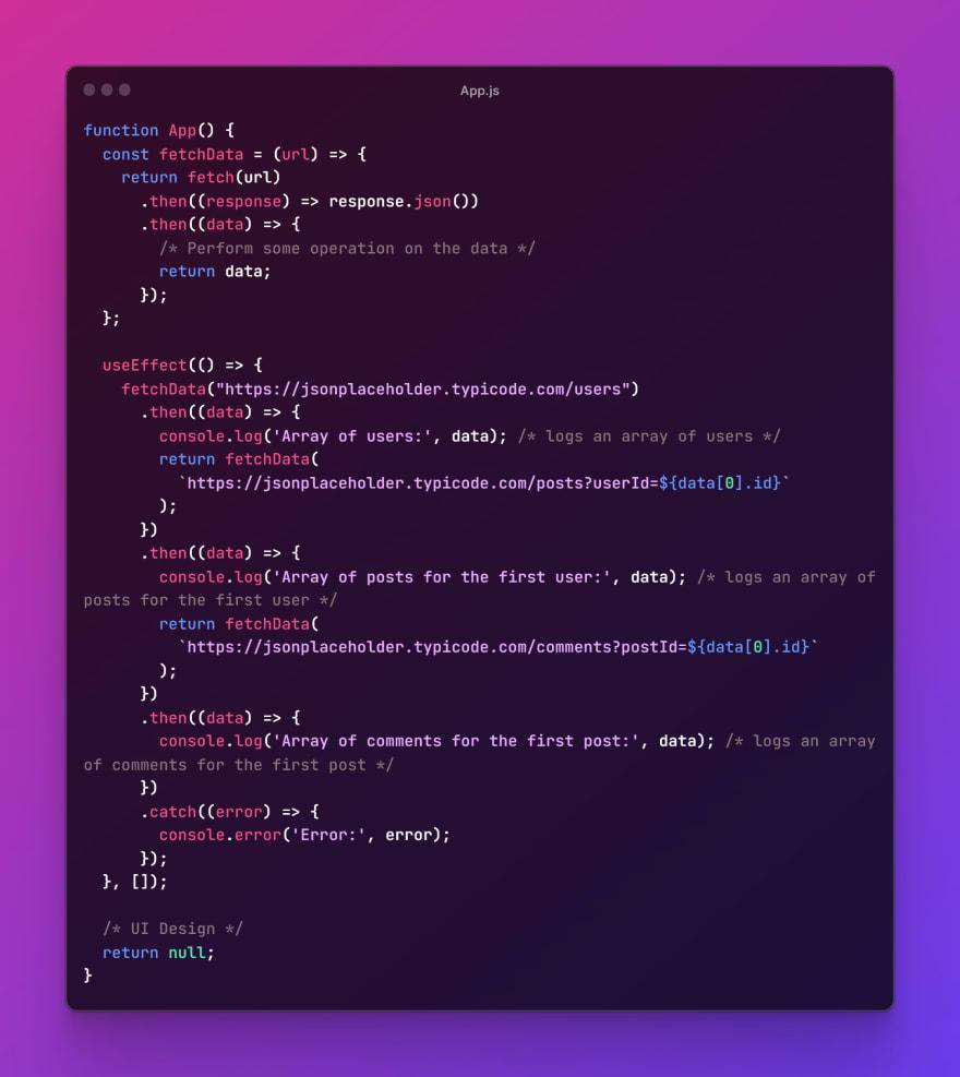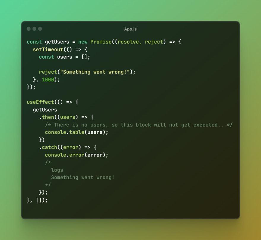 Promise 链首先从 API 获取用户数据,然后使用第一个用户的 ID 获取他们的帖子,最后使用第一个帖子的 ID 获取该帖子的评论。链中的每个then()方法都处理前一个 Promise 的解析值,最后一个catch()方法处理链中发生的任何错误。