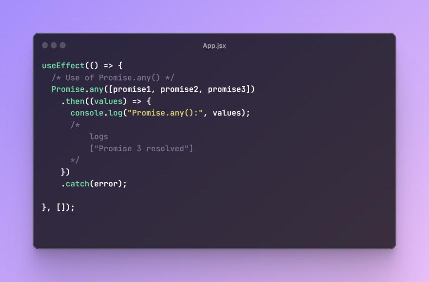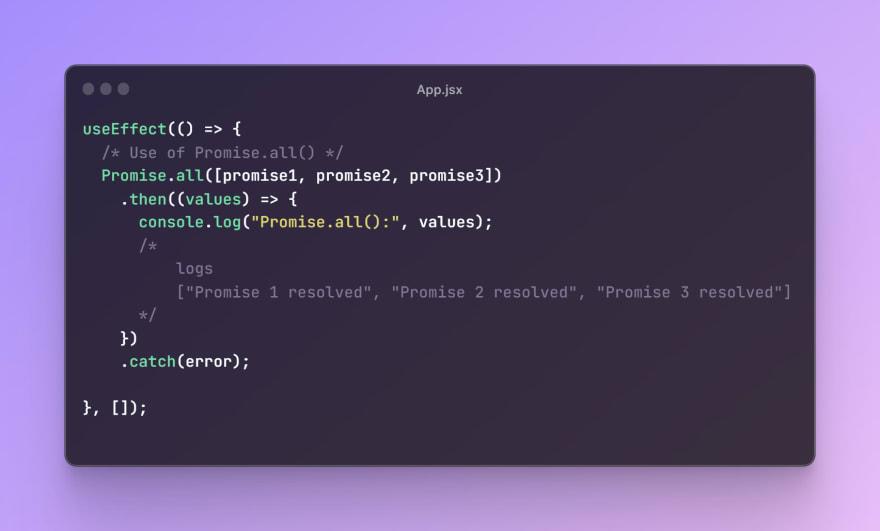 下面的实例使用Promise.all()方法,该方法接受一组承诺并等待所有承诺得到履行。一旦所有的 promise 都得到解决,then()就会执行方法,该方法按照它们在 promise 数组中传递的顺序返回一个值数组。在这种情况下,所有三个承诺都已解决,并且它们的值被记录到控制台。