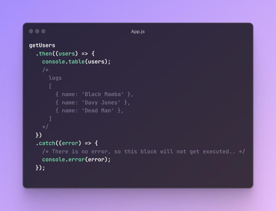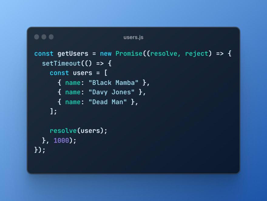 上面示例中的 Promise 将在一秒后 resolve,并且 resolved Promise 的值将是 users 数组。