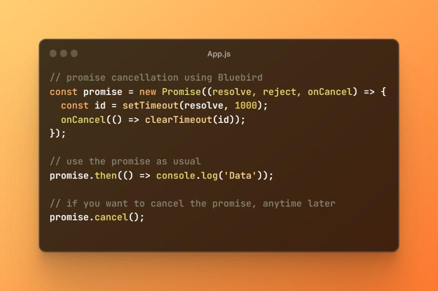 Bluebird是一个流行的 JavaScript Promise 库,它提供高级功能,包括 Promise 取消。Promise 取消是取消 Promise 的能力,这对于取消正在进行的或长时间运行的异步操作很有用。