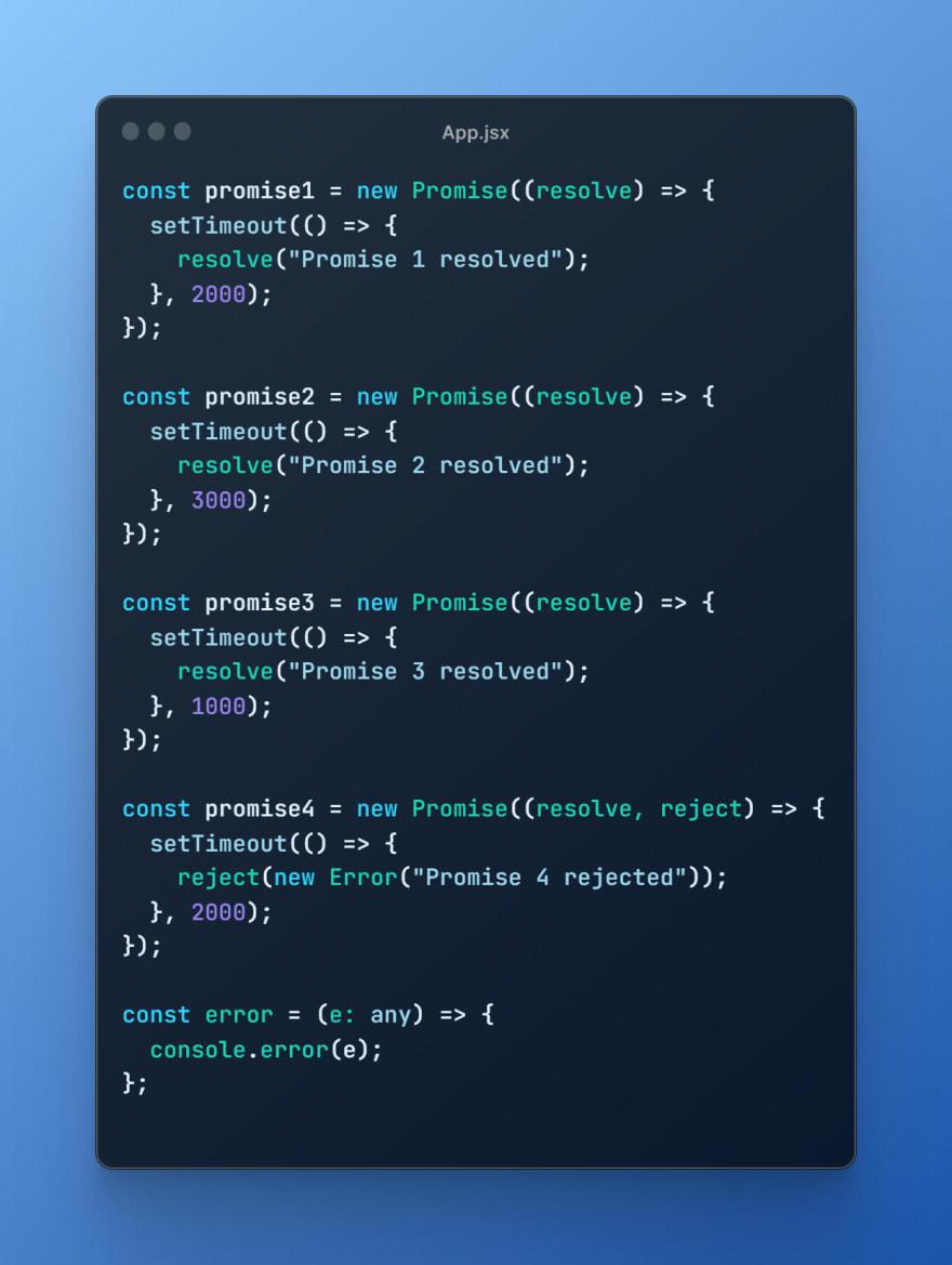 使用语法创建四个承诺new Promise()。每个承诺在使用方法的特定超时期限后被解决或拒绝setTimeout()。该error函数被定义为将任何错误记录到控制台。