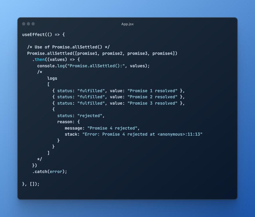 下面的实例使用的Promise.allSettled()方法接受一组承诺并等待所有承诺得到解决,即 resolved 或 rejected。一旦所有的承诺都得到解决,then()就会执行返回一个对象数组的方法,每个对象包含每个承诺的状态和价值或原因。在这种情况下,所有承诺都已解决,因此所有承诺的状态和值或原因都记录到控制台。