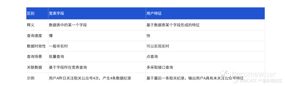 在这里额外描述一下关于“用户特征”和“宽表字段”的区别,详见下图: