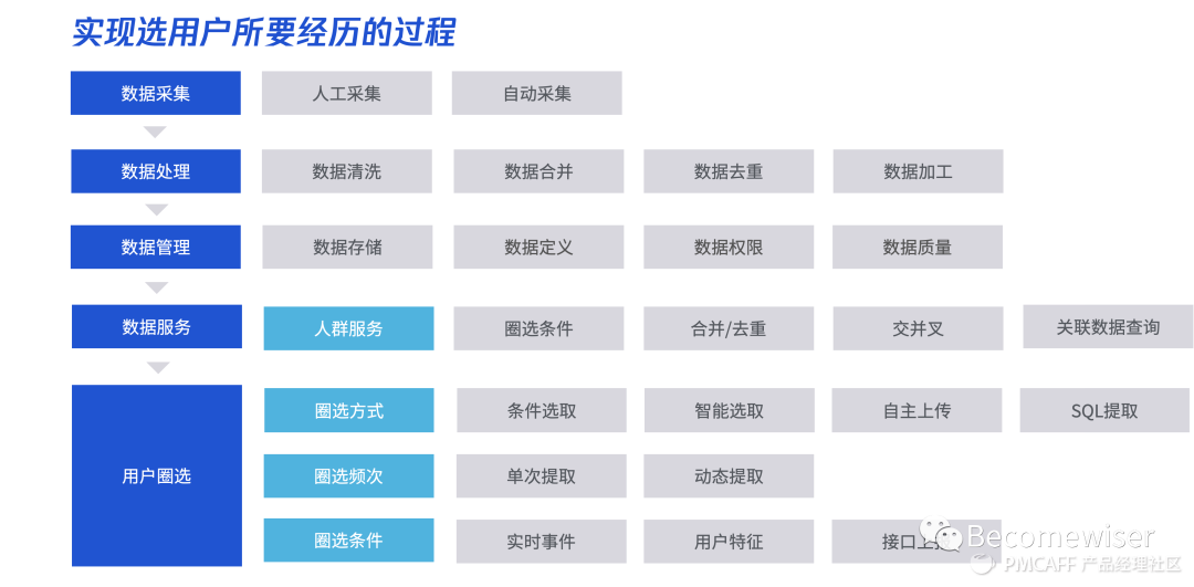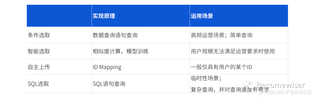 在选取用户时须考量的产品功能为:圈选方式、圈选频次、圈选条件及人群服务。