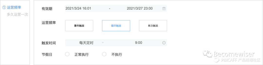 事件触发则不依赖时间,基于事件发生实时触发,这一类型没有运营时间的概念。而循环触发、单次触发则会有时间的概念。