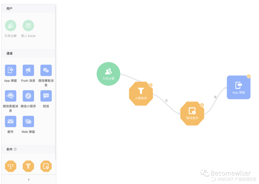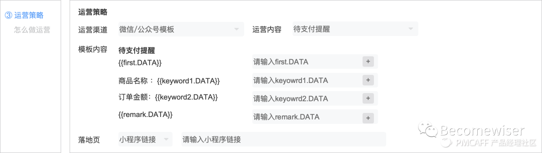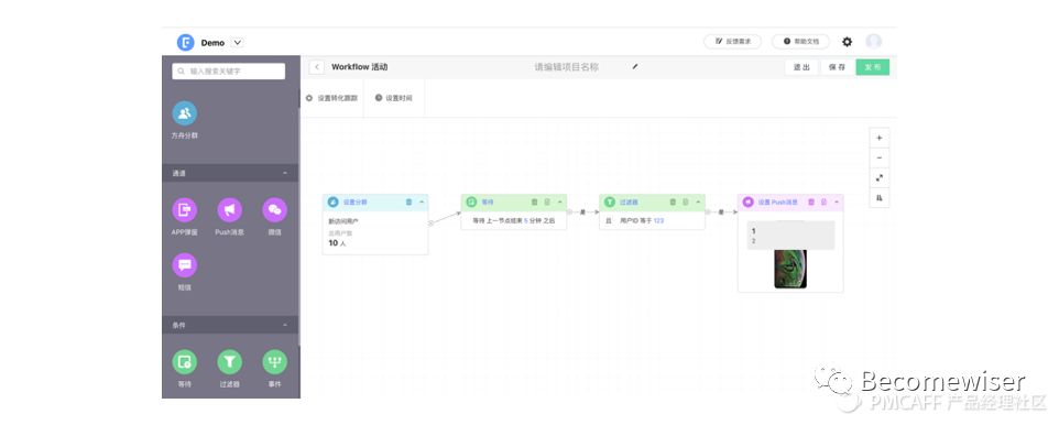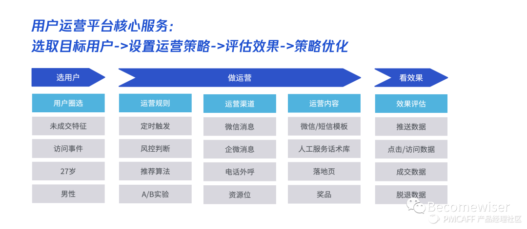 将其分解为产品术语则是:在圈选目标用户并设置运营规则,基于运营渠道发送指定运营内容,效果追踪后再进行自助优化调整。